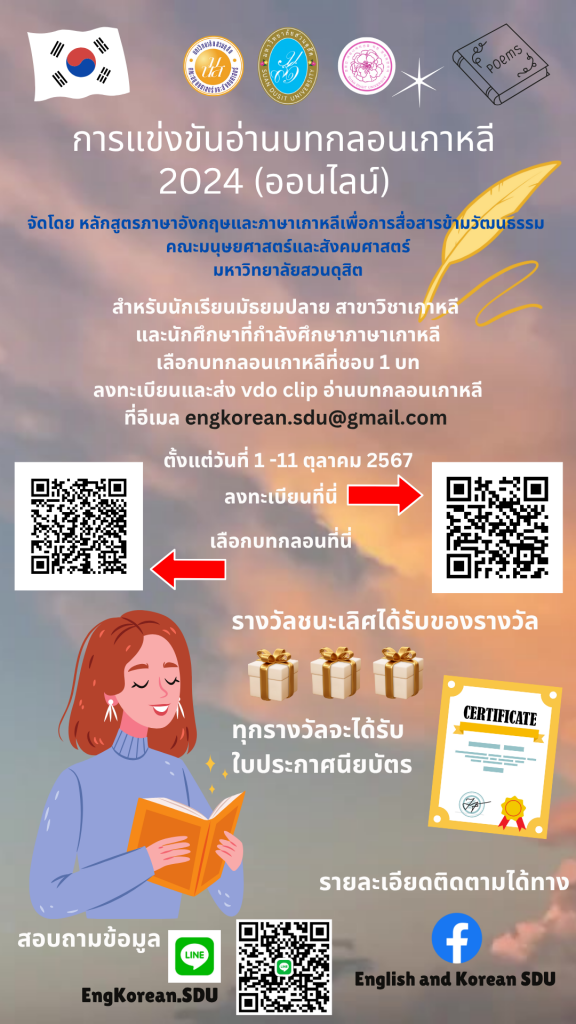 ข่าวกิจกรรมนักศึกษา | ข่าวประชาสัมพันธ์ | มุมกิจกรรม การแข่งขันอ่านบทกลอนเกาหลี 2024 (ออนไลน์) ByDatacenter ARIT September 30, 2024August 13, 2025