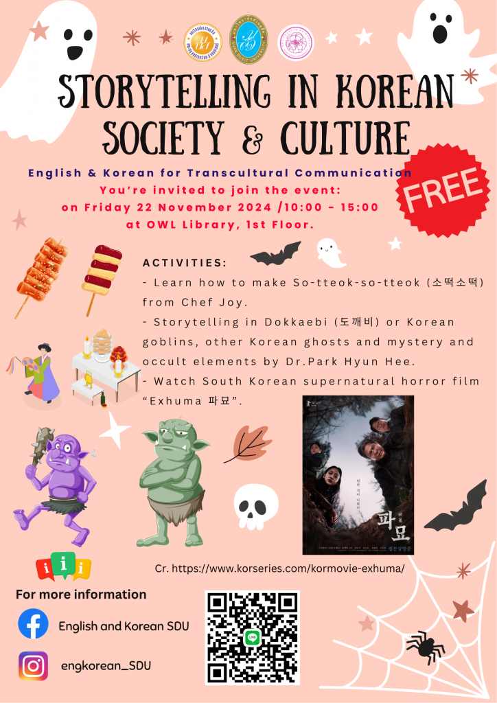 หลักสูตรศิลปศาสตรบัณฑิต สาขาภาษาอังกฤษและภาษาเกาหลีเพื่อการสื่อสารข้ามวัฒนธรรม ยินดีต้อนรับน้องๆ มาเรียนรู้วิธีการทำโซต็อกโซต็อก (소떡소떡) โดย เชฟจอย จากโรงเรียนการเรือน พร้อมกับฟังเรื่องราวลี้ลับ ตำนาน ความเชื่อของคนเกาหลี และรับชมภาพยนตร์แนวสยองขวัญอย่าง Exhuma: ขุดมันขึ้นมาจากหลุม ไปพร้อมๆ กัน