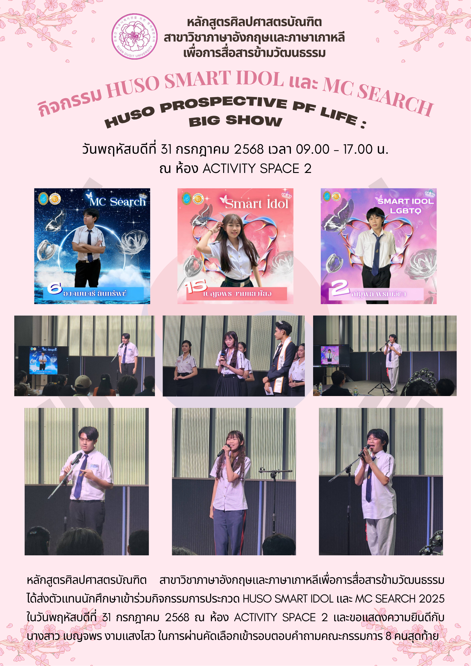 หลักสูตรศิลปศาสตรบัณฑิต สาขาวิชาภาษาอังกฤษและภาษาเกาหลีเพื่อการสื่อสารข้ามวัฒนธรรม ได้ส่งตัวแทนนักศึกษาเข้าร่วมกิจกรรมการประกวด HUSO Smart idol และ mc search 2025 ในวันพฤหัสบดีที่ 31 กรกฎาคม 2568 ณ ห้อง Activity space 2 และขอแสดงความยินดีกับนางสาว เบญจพร งามแสงไสว ในการผ่านคัดเลือกเข้ารอบตอบคำถามคณะกรรมการ 8 คนสุดท้าย